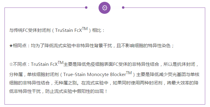 圖1A-B分別為T(mén)ruStain FcXTM阻斷和True-Stain Monocyte BlockerTM阻斷后的CD14 BV421TM和CD3 APC /Cy7共染結(jié)果圖。