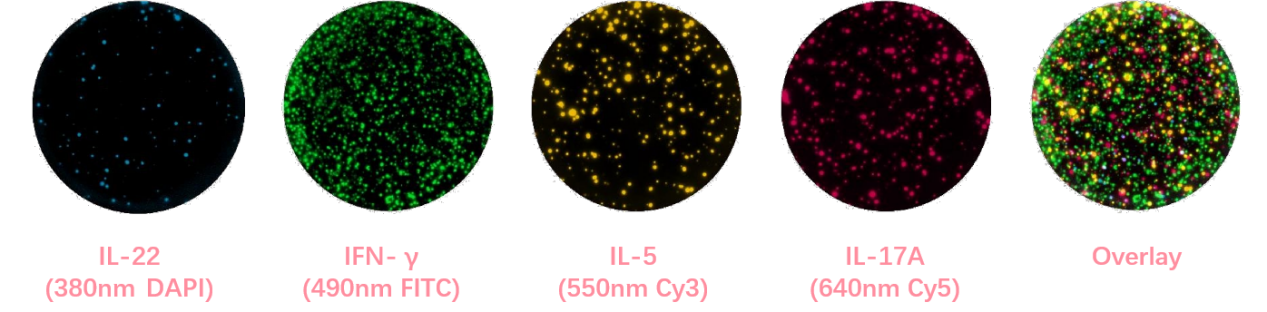 該圖為Mabtech FluoroSpot Plus: Human IL-22/IFN-γ/IL-5/IL-17A(Cat#FSP-18010803-2)的實(shí)驗(yàn)結(jié)果,四個(gè)檢測通道對(duì)應(yīng)的DAPI,F(xiàn)ITC,Cy3,Cy5。