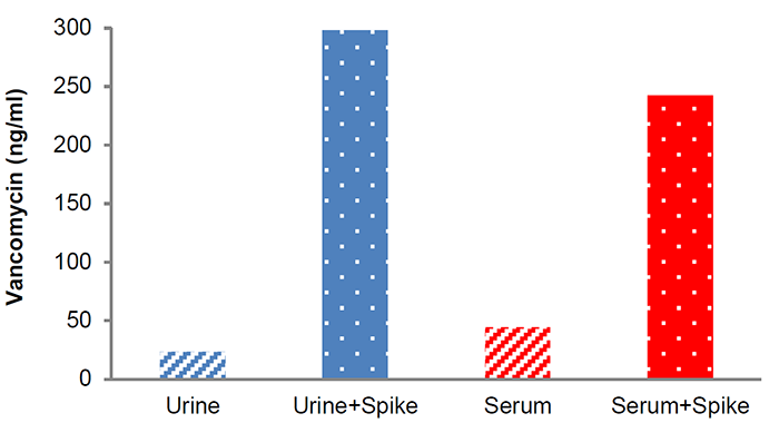 加標(biāo)回收實(shí)驗(yàn)人血清和尿液樣本加300ng/ml的萬古霉素,回收率為80-100%。