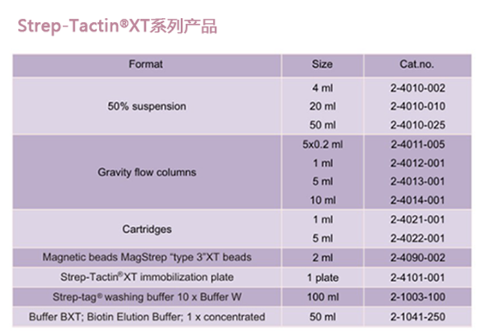 Strep-tag?是IBA lifesciences基于生物素(Biotin)和鏈霉親和素(Streptavidin)之間的結(jié)合反應(yīng)開(kāi)發(fā)的蛋白純化系統(tǒng)。第三代Strep-tag?系統(tǒng):「Strep-Tactin?XT:Twin-Strep-tag?」蛋白純化系統(tǒng),其結(jié)合力可達(dá)pM級(jí)別但仍保持結(jié)合的可逆性和固定化蛋白的溫和復(fù)蘇能力。因此,用Strep-Tactin?XT系統(tǒng)能有效提高您目標(biāo)蛋白的純度,解決您實(shí)驗(yàn)中所遇到的常見(jiàn)問(wèn)題。