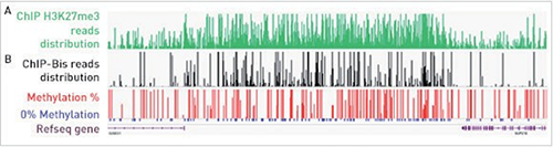圖3 A: 使用Diagenode的iDeal ChIP-seq Kit對(duì)人細(xì)胞系Gm12878 H3K27me3標(biāo)記的組蛋白進(jìn)行染色質(zhì)免疫沉淀;B: 使用Premium WGBS Kit對(duì)ChIP’d DNA進(jìn)一步處理并測(cè)序。