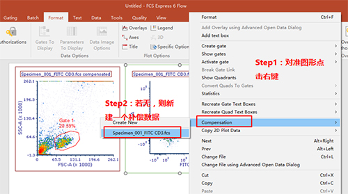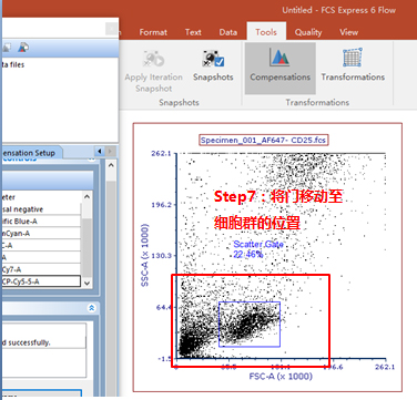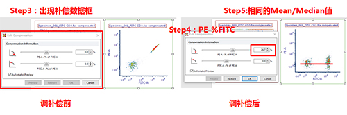 此時可以手動調(diào)節(jié)兩通道之間的補償,該數(shù)據(jù)為FITC單管,可用PE-FITC調(diào)節(jié)FITC滲漏到PE通道去的熒光。步驟如下圖所示: