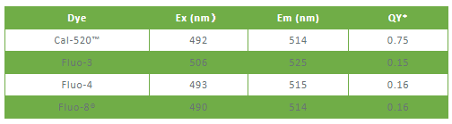 因?yàn)樵撓盗腥玖嫌懈叩牧孔赢a(chǎn)率,是Fluo-3 or Fluo-4.的3倍,什么意思呢,就是吸收同樣數(shù)目的光子,Calbryte?系列能發(fā)出的熒光強(qiáng)度是它們的3倍,而且激發(fā)光同樣是常見的499nm。