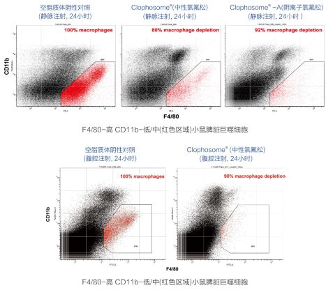 并且,在單次靜脈注射或腹腔注射0.2 ml Clophosome?(中性氯弗松)后自24小時起脾臟和肝臟中巨噬細(xì)胞耗竭可持續(xù)一周保持在80%以上,如果每4天注射一次,高效巨噬細(xì)胞耗竭可維持?jǐn)?shù)周之久。此外,Clophosome?-A(陰離子氯弗松),除保持了Clophosome?(中性氯弗松)所有優(yōu)點(diǎn)之外,更使得單次注射后巨噬細(xì)胞的耗竭率高達(dá)90%以上。