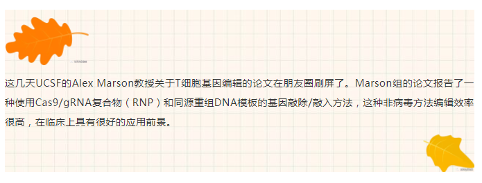 文章的共同通訊作者為密西根大學(xué)的徐捷教授和康奈爾大學(xué)的夏曉峰教授。這篇文章和Marson組文章的共同點(diǎn)是都使用電轉(zhuǎn)Cas9RNP的方法在一些之前認(rèn)為很難編輯的細(xì)胞上取得了很高的同源重組效率。Marson實(shí)驗(yàn)室的研究更加深入,在免疫治療上幾個(gè)重要的基因位點(diǎn)做了基因編輯的研究,不僅對(duì)于CAR-T可能有很大幫助,對(duì)于TCR-T的制備可能也有重要意義。