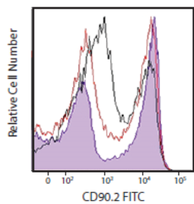 (將小鼠脾臟細(xì)胞分別用TruStainFcX TM PLUS0.25μg/test,紫色填充直方圖),TruStainFcX TM(克隆93,1μg/test,紅線)封閉之后用CD90.2FITC染色,與未處理的小鼠脾臟細(xì)胞(黑線)作比較。結(jié)果顯示TruStainFcXTM PLUS封閉效果更優(yōu)。)