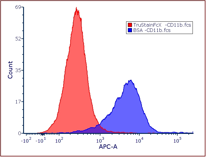 (OCI-AML3細(xì)胞系用TruStainFcX(Cat#101319)封閉(紅色TruStainFcX直方圖)以及用5%BSA封閉(藍(lán)色BSA直方圖)后,染APC-CD11b(cat#101211,cloneM1/70)結(jié)果)