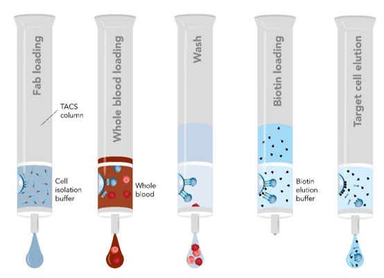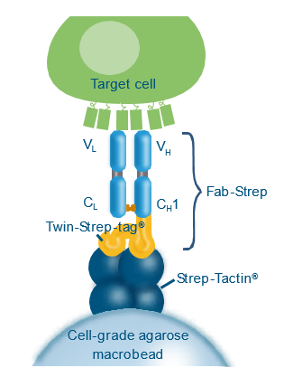 Fab-TACS柱子填充了包被有Strep-Tactin多聚體的細(xì)胞級(jí)瓊脂糖基質(zhì),偶聯(lián)上Strep-tagFab片段(Fab-Streps)特異性的結(jié)合到瓊脂糖基質(zhì)上。隨后,加入全血或其他血液制劑流過(guò)柱子。目的細(xì)胞通過(guò)特異性的與Fab-Streps作用從而結(jié)合到瓊脂糖基質(zhì)上,其他非目的細(xì)胞則有效的被洗去。最后,加入生物素使目的細(xì)胞從Fab-Streps上解離。至此,就已分離得到不帶任何標(biāo)記的、真實(shí)的目的細(xì)胞可用于下游的實(shí)驗(yàn)研究。
