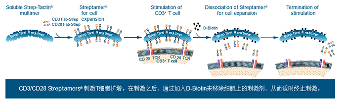 Streptamers?應(yīng)用于T細(xì)胞擴(kuò)增是目前T細(xì)胞擴(kuò)增術(shù)中一項(xiàng)較新穎的技術(shù)。該技術(shù)的核心在于:將抗CD3和抗CD28Fab-Streps結(jié)合到Strep-Tactin多聚體上,使它們形成可溶性的蛋白復(fù)合物。在刺激之后,通過(guò)加入D-Biotin來(lái)移除細(xì)胞上的刺激劑,從而適時(shí)終止刺激。