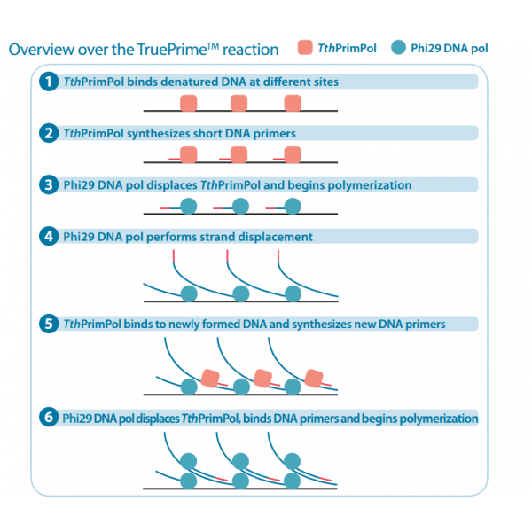 TruePrime?采用MDA技術(shù),基于新型的TthPrimPol 引物酶和Phi29 DNA聚合酶,擴增過程無需添加隨機引物,減少了擴增偏倚,提高了擴增過程的覆蓋率和保真性,并且對于污染的外源DNA不敏感,可重復(fù)性好。TruePrime?可用于單個細胞或少量細胞的全基因組擴增,與常見的NGS平臺如Illumina和IonTorrent等兼容性良好。