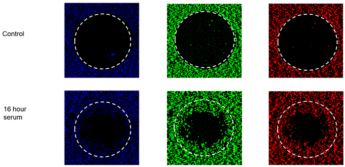 細(xì)胞排斥區(qū)分析(間隙封閉法)是Platypus公司獲得專利的技術(shù)。讓細(xì)胞在孔的底部圍繞一個(gè)阻止細(xì)胞生長的區(qū)域(如在孔底部中央放置阻塞物)生長,實(shí)驗(yàn)在移除阻塞物后開始,可觀察單層細(xì)胞遷移到原先的空白區(qū)域中。