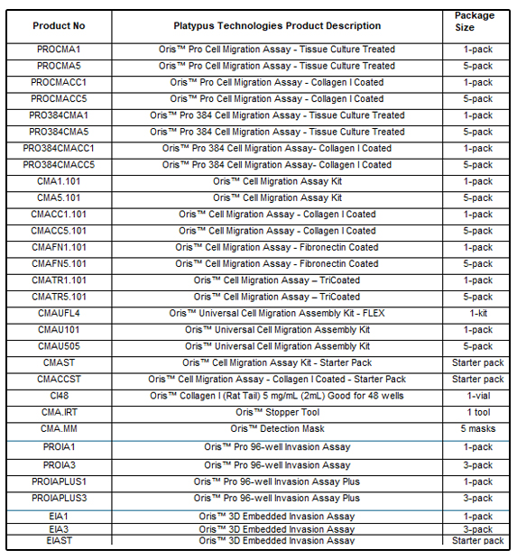 美國Platypus Technologies公司建立于2000年,是細(xì)胞分析領(lǐng)域產(chǎn)品的耗材供應(yīng)商,熱賣產(chǎn)品為OrisTM和OrisTM Pro系列細(xì)胞遷移和侵襲實(shí)驗(yàn)試劑盒。其開發(fā)的用于檢測細(xì)胞遷移和侵襲的細(xì)胞排斥區(qū)分析法,克服了Transwell和劃痕實(shí)驗(yàn)的缺點(diǎn)。
