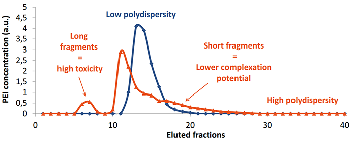 由于長片段的PEI對細胞有毒性,而短片段PEI結(jié)合DNA能力較差(見紅色),所以優(yōu)化PEI的片段大小,降低其分散性能減少細胞毒性,同時增加結(jié)合DNA的能力(見藍色)和轉(zhuǎn)染重復(fù)性。