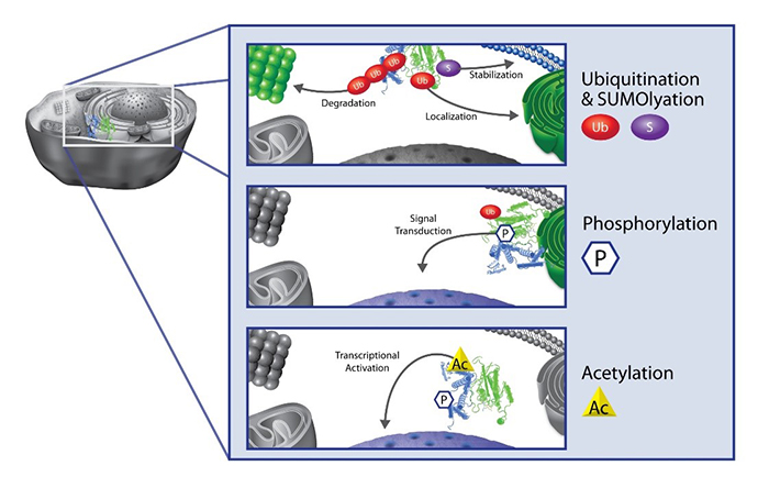 盡管目前已知的PTM的種類超過400,但只有少數(shù)幾個被詳細(xì)研究過,主要包括甲基化、磷酸化、乙酰化、泛素化和SUMO化,它們被證明是幾乎所有細(xì)胞的關(guān)鍵調(diào)節(jié)因素,包括信號轉(zhuǎn)導(dǎo)、表觀遺傳學(xué)、基因和蛋白質(zhì)表達(dá)、蛋白質(zhì)穩(wěn)定性和定位以及細(xì)胞免疫。