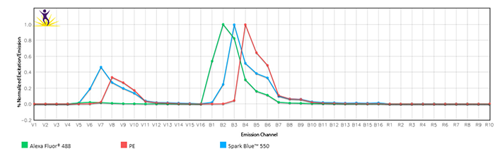 Spark Blue?550488nm藍(lán)色激光激發(fā)并在550nm處發(fā)射,介于AlexaFluor?488FITCPE的峰值發(fā)射之間。SparkBlue?550的亮度與FITC相當(dāng)。405nm紫外激光可以進(jìn)一步增加這幾種熒光不互相混合的情況。
