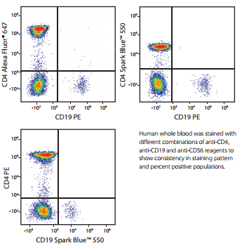 用抗CD4和抗CD19的不同熒光抗體組合對(duì)人全血染色,結(jié)果顯示Spark Blue?550染色具有有效性以及和其他常見熒光PE、AF647相比染色后相應(yīng)群體比例也具有一致性。