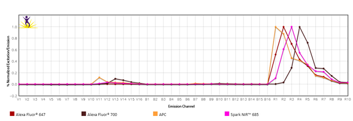 由于近紅外(NIR)范圍內(nèi)的熒光發(fā)射光譜以及光電倍增管(PMT)對(duì)800nm以上發(fā)射波長(zhǎng)的不敏感性,633nm紅色激光器僅限于2-3個(gè)熒光。借助全光譜流式細(xì)胞儀,APCAlexaFluor?700的發(fā)射峰之間的光譜間隙可檢測(cè)Spark NIR?685等新型熒光。Spark NIR?685可被633 nm激發(fā),最大發(fā)射波長(zhǎng)為685 nm,與FITC具有相似的亮度。