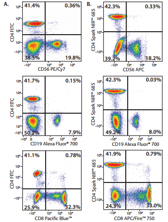 來(lái)自相同供體的全血用圖AB配色方案染色。A包括抗人CD4-FITC、CD19-Alexa Fluor700、CD8-PacificBlue TM、CD3-PE以及CD56-PE-Cy7的抗體。B包括抗人CD4-Spark NIR TM685CD19-AlexaFluor 700、CD8-APC-FireTM 750、CD3-PE以及CD56-APC的抗體。