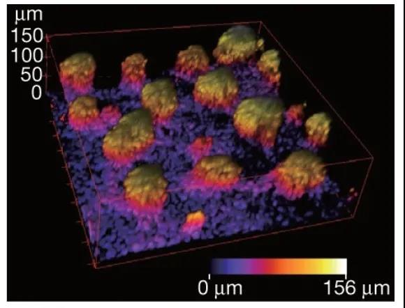 圖像以三維(3D)方式堆疊,并根據(jù)從下到上的距離來著色。