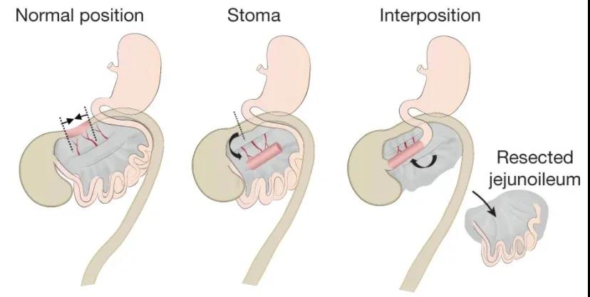 分兩步進行的手術(shù)方法,用于在空腸的起點和回腸的終點之間插入需要移植的結(jié)腸類器官。