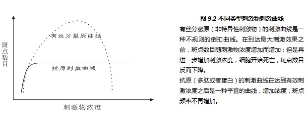 其一、非特異性的刺激物刺激效果不穩(wěn)定。如圖9.2所示,非特異性的刺激物(有絲分裂原Mitogen)的刺激曲線幾乎沒有平坦的部分。也就是說,刺激物的濃度有細微變化,馬上就會體現(xiàn)在刺激斑點數(shù)目的變化上了,這樣實驗結(jié)果很難完全重現(xiàn)。相反,抗原的刺激曲線非常平坦,只要達到有效刺激濃度,斑點頻率就不再變化。