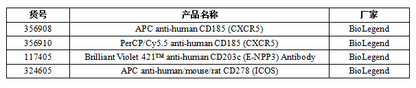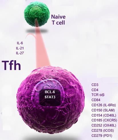 主要標(biāo)記物:Tfh 細(xì)胞屬于 CD4+  T 細(xì)胞亞群,其表型特征為 CXCR5+CD40LhiICOShi ,并且還表達(dá)細(xì)胞因子 IL-21 和轉(zhuǎn)錄因子 Bcl-6 。 IL-21 和 Bcl-6 ( B-cell  lymphoma  6 對(duì)于 Tfh 細(xì)胞的發(fā)生和發(fā)育至關(guān)重要。其中 IL-21 誘導(dǎo) Tfh 的分化并促進(jìn)其表面 CXCR5 的表達(dá); Bcl-6 對(duì)于 Tfh 轉(zhuǎn)移到淋巴濾泡和 B 細(xì)胞發(fā)生中心( Germinal  center 的形成必不可少。