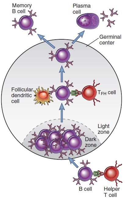 Tfh 細(xì)胞的主要作用是增加高親和力 B 細(xì)胞和長(zhǎng)壽漿細(xì)胞的形成,并幫助他們轉(zhuǎn)移到發(fā)生中心(GC)。在接受抗原刺激后,初始 B 細(xì)胞首次移動(dòng)到 T 細(xì)胞區(qū),且在來自 Tfh 細(xì)胞和抗原呈遞細(xì)胞的共刺激作用下開始活化并形成發(fā)生中心。當(dāng)發(fā)生中心的 B 細(xì)胞開始分化為漿細(xì)胞或記憶 B 細(xì)胞時(shí), Bcl-6 會(huì)阻止 B 細(xì)胞的增殖,因?yàn)?Bcl-6 可以抑制 B 細(xì)胞活化基因的表達(dá),如 CD69、 STAT1 和 CD80 等,同時(shí)也會(huì)通過調(diào)節(jié) Prdm1 來抑制發(fā)生中心的 B 細(xì)胞向漿細(xì)胞分化。 Tfh 細(xì)胞通過 CD40 的作用致使 Bcl-6 轉(zhuǎn)錄沉默,從而促使發(fā)生中心 B 細(xì)胞存活和增殖。且在這一過程中,CD40L、PD-1、BAFF、IL-4 和 IL-21 等信號(hào)分子的參與也是必不可缺的。