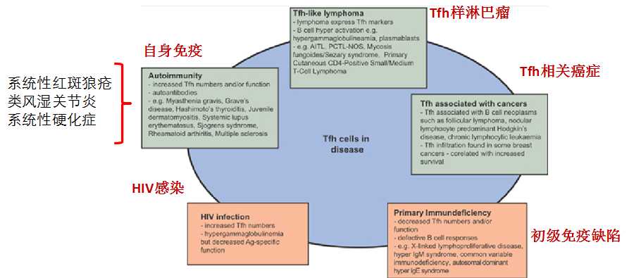 因此,基于 Tfh 細(xì)胞的功能特性,其與多種疾病密切相關(guān)。 Tfh 細(xì)胞及相關(guān)分子的缺陷會(huì)導(dǎo)致正常的 B 細(xì)胞反應(yīng)不能完成,產(chǎn)生體液免疫缺陷。相反, Tfh 功能亢進(jìn)也會(huì)導(dǎo)致病態(tài)的自身免疫反應(yīng),介導(dǎo)自身免疫病的發(fā)生。目前對(duì) Tfh 的研究也主要集中在其與自身免疫疾病和 HIV 的關(guān)系上面。