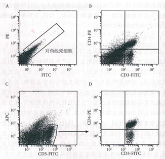 雖然死細胞位于散點圖的對角線上,但是對角線上的細胞確不一定是死細胞,因為雙陽性細胞如果在x軸和y軸的熒光信號相似時,也可以位于對角線上。所以,散點圖對角線上的細胞可能是死細胞,也可能是雙陽性細胞。如圖1-B所示,樣本細胞為正常小鼠脾臟細胞,標記 FITC-抗CD3抗體和PE-抗CD4抗體,F(xiàn)ITC和PE雙陽性的CD4 T細胞和死細胞混在一起,無法區(qū)分。但是死細胞和雙陽性細胞的形狀是不一樣的,死細胞呈現(xiàn)連續(xù)的線型分布,而雙陽性細胞群呈現(xiàn)圓形的群體分布,因此,可以從對角線上的細胞群體的形狀大致判斷細胞的性質(zhì)。雖然不能根據(jù)熒光強度的強弱來區(qū)分該熒光信號是來自于死細胞的非特異性熒光還是來自熒光素產(chǎn)生的熒光,但是可以利用在散點圖上死細胞位于對角線的特點來區(qū)分死細胞和陽性活細胞。如圖1-C所示,x軸表示FITC通道(樣本細胞標記有FITC-抗CD3抗體),y軸表示APC通道(閑置通道),借用該散點圖可以明確區(qū)分圖1-B中無法區(qū)分的死細胞和雙陽性細胞。此時只需要將排除了死細胞后的CD3 T細胞設門,將門內(nèi)的細胞顯示于新的FITC-PE散點圖中,如圖1-D,此時該散點圖內(nèi)的細胞都是活細胞,因為樣本細胞同時標記有PE-抗CD4抗體,所以圖中的細胞明顯分為兩群,雙陽性的是CD4T細胞,單陽性的是CD8 T細胞。