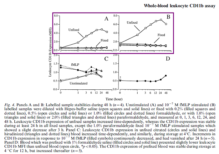 最常見的情況是染色處理完已經(jīng)到很晚,平臺老師已經(jīng)下班或者自己的身體已經(jīng)扛不住通宵做實驗了,這個時候需要對樣本進行固定處理,放到第二天檢測,這里的固是定為了保持檢測指標的穩(wěn)定性;另一方面,當樣本特別多的時候,第一管樣本和最后一管樣本的時間間隔會很久,這種情況下考慮上機前做一下固定,保持前后數(shù)據(jù)的一致性,比如CD11b這個指標在白細胞中的表達會隨著樣本放置時間的增加而上調(diào)。