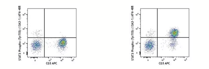 在蛋白翻譯后修飾(磷酸化、乙?;?、甲基化等)的研究過程中,固定劑不僅可以有效的“固定”住翻譯后修飾的位點(絲氨酸、蘇氨酸、酪氨酸等),也可以防止目標位點在活細胞中很快降解(比如磷酸酶會去除磷酸化修飾、去甲基化酶會移除甲基化修飾等)。下面的例子是用IL-6的重組蛋白刺激人外周血15分鐘后看STAT3705位酪氨酸的磷酸化水平,在刺激完樣本后就需要通過固定來實現(xiàn)目的氨基酸磷酸化水平“停留”在IL-6刺激15分鐘這個節(jié)點上。