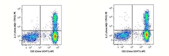 左圖:human PBMC刺激完當天染色后上機檢測;右圖:同一樣本,表染和固定后,保存在Cyto-Last? buffer里面,14天后做胞內(nèi)染色并上機。