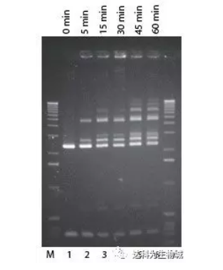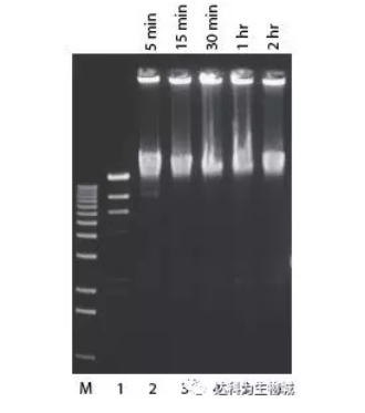 pUC 19 DNA用Pvu II消化,然后按標(biāo)準(zhǔn)連接反應(yīng)使用2U Fast-Link? ligase進(jìn)行連接(泳道1-6). 泳道 M,1-kb ladder;泳道1,無酶對照;泳道2-6, 分別為5 min, 15 min, 30 min, 45min, 1 hr連接結(jié)果。
