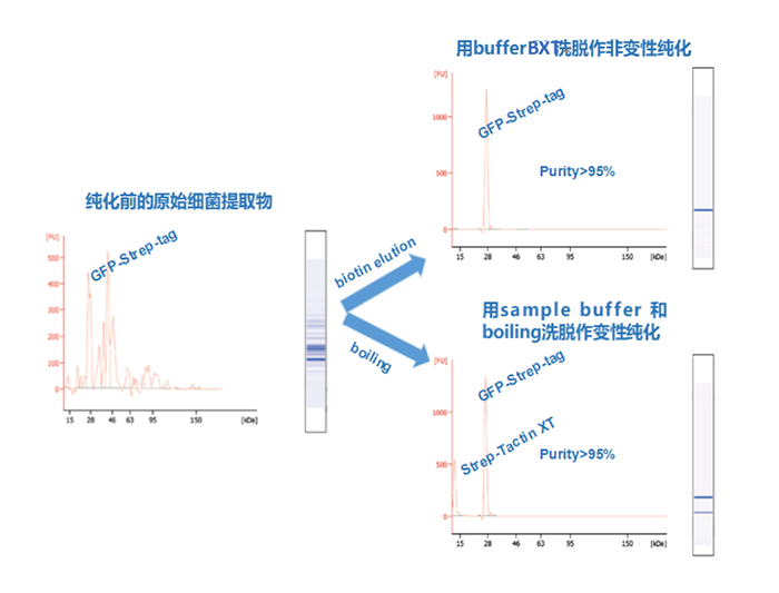 使用Agilent Bioanalyzer 2100 System分析提取出來的蛋白,發(fā)現(xiàn)不管是直接以Buffer BXT (含Biotin)將靶蛋白洗脫下來,或是加入sample buffer煮沸來分離目標(biāo)蛋白,都能得到高純度的蛋白。