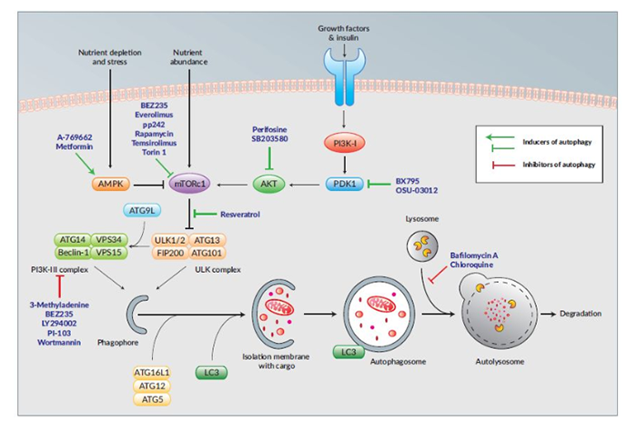 自噬是原生分解程序,由細(xì)胞內(nèi)應(yīng)激物(營養(yǎng)物和能量貧乏)引起。自噬由生成自噬體開始,這一步驟由一系列蛋白調(diào)控,包括VPS34型磷脂?;迹?/span>PI)3激酶復(fù)合體,隨后與溶酶體的融合將自噬體酸化。自噬的阻斷有多種形式,例如PI3激酶抑制劑可通過抑制自噬捕獲動作而阻斷自噬進(jìn)程,或者用抑制溶酶體酸化的抑制劑阻止自噬溶酶體的形成和自噬降解。自噬進(jìn)程是被縝密調(diào)控的。mTORC1,一種對營養(yǎng)物和生長因子敏感的激酶,是自噬的主要阻遏器。因此,mTORC1及其信號通路的抑制劑可誘導(dǎo)產(chǎn)生自噬。