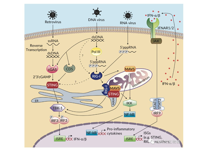 感受器cGAS和RIG-I通過單獨的接頭蛋白來識別不同的核酸和信號。cGAS感受細胞質(zhì)中異常DNA的存在和濃度,而后通過環(huán)二核苷酸2’3’-cGAMP[2]募集干擾素基因刺激因子(STING, or MITA/ERIS/MPYS)。RIG-I檢測出5`-二/三磷酸末端未加帽的病毒RNA和短平末端雙鏈部分的病毒RNA后,其與線粒體抗病毒信號蛋白(MAVS, or IPS-1/VISA/Cardif)[1]結(jié)合。它們激活后,cGAS/STING和RIG-I/MAVS將觸發(fā)共同的信號級聯(lián)反應(yīng)導(dǎo)致I型干擾素(IFNs)和促炎性因子的產(chǎn)生。