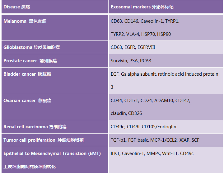 腫瘤細胞和它們的環(huán)境之間的直接作用之所以在腫瘤發(fā)展進程中至關重要,其中重要的原因就是外泌體在細胞間信號傳遞中起關鍵作用。釋放到細胞外環(huán)境的外泌體可以促進血管生成,腫瘤細胞增殖以及血栓形成,除此之外還有細胞外基質(zhì)的重塑。下面表格中列舉了常見腫瘤的一些外泌體標記。